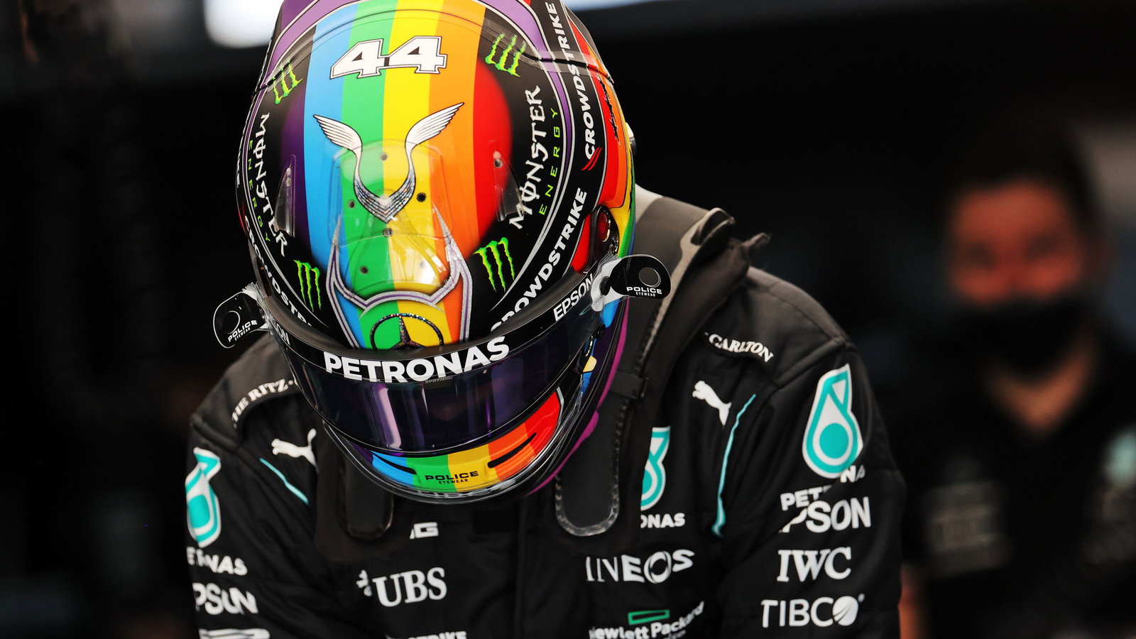 Hamilton meluncurkan helm baru menjelang latihan Jumat di Sirkuit Internasional Losail, dengan warna pelangi mendominasi skema warna.