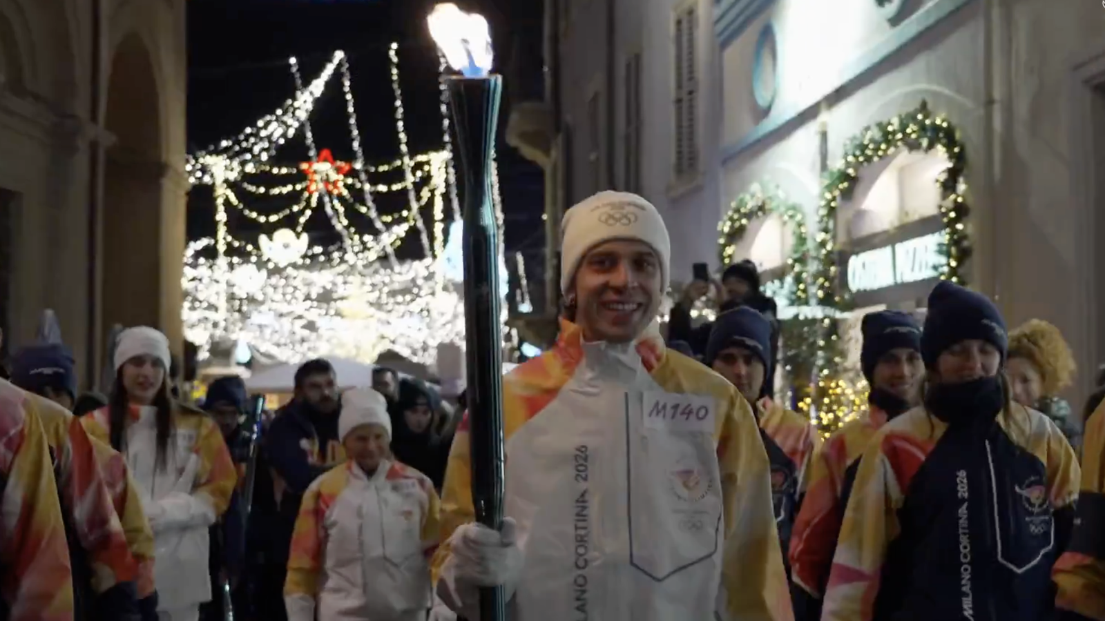 Pada hari Senin, pembalap Aprilia MotoGP Marco Bezzecchi membawa obor melalui jalan-jalan Rimini.