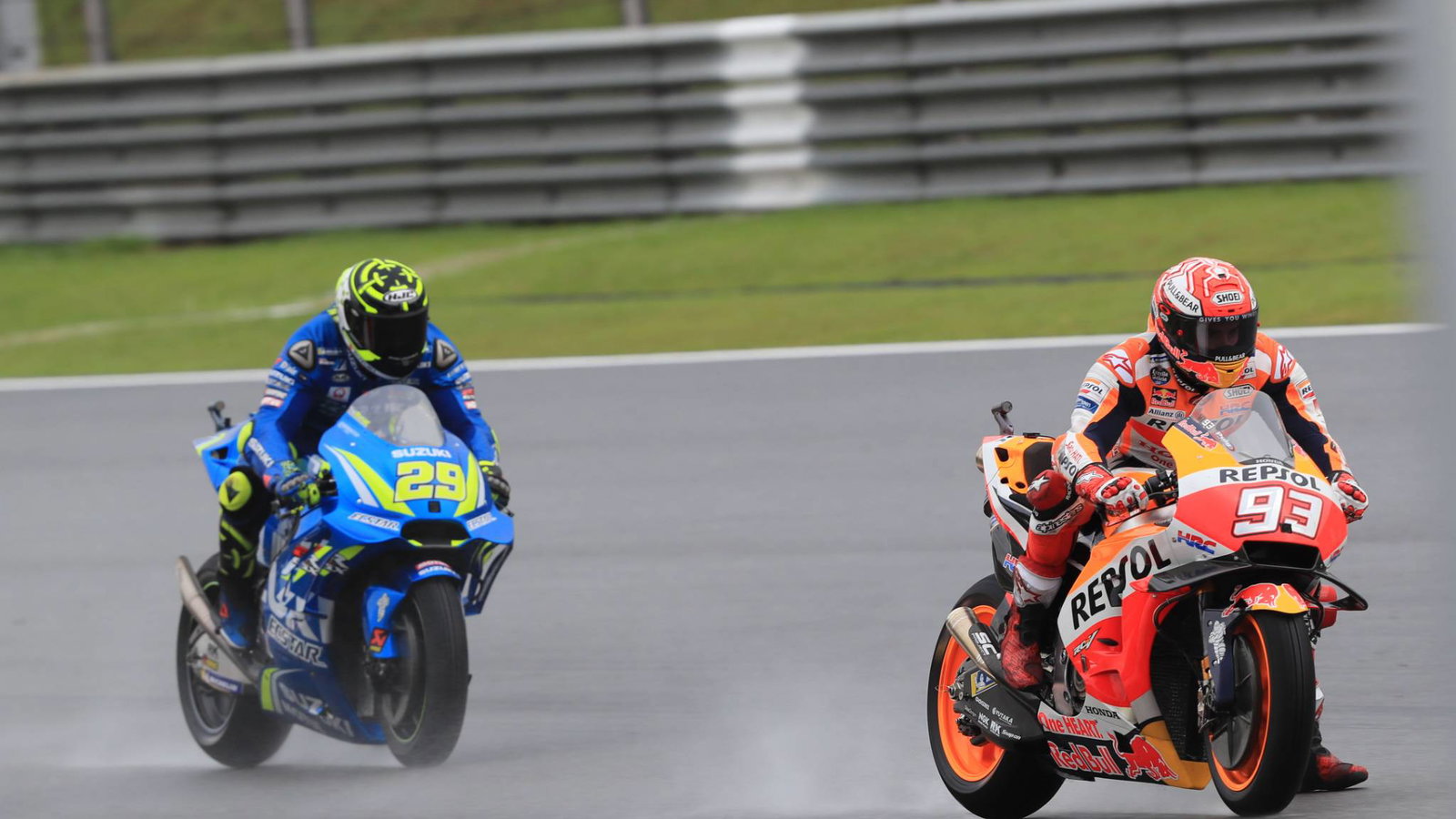 Dani Pedrosa mengklaim tempat ke- 10 di pabrikan Honda di depan Maverick Vinales yang berjuang di medan basah, tertinggal 2,6 detik dari penjaga gawang Marquez meskipun ia bisa menyamainya di musim kering dengan Movistar Yamaha, dengan Aprilia Aleix Espargaro menyelesaikan 12 besar setelahnya. dia mengalami crash di awal Q2.