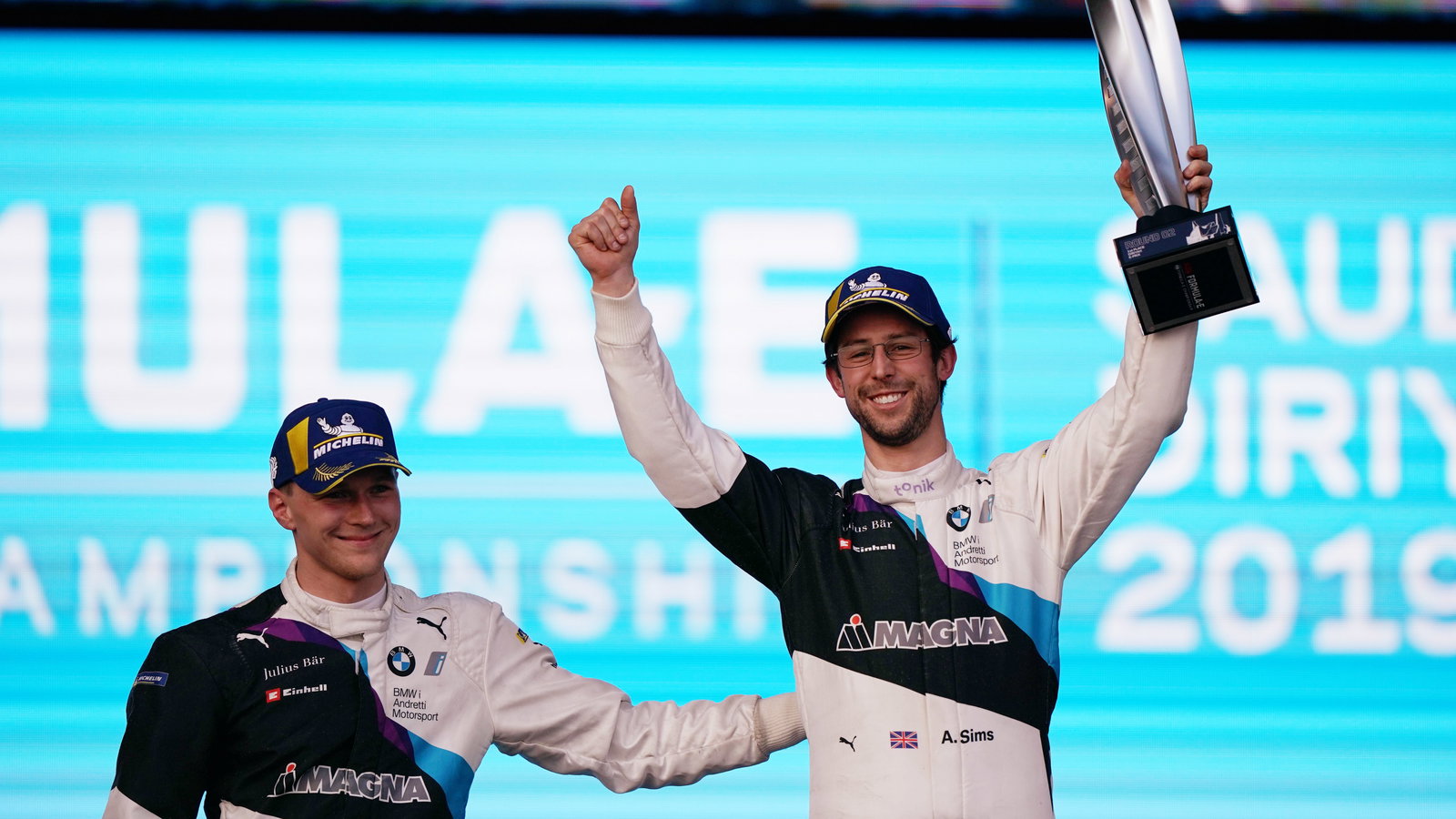 Alexander Sims scored his maiden Formula E victory in dominant fashion by leading from lights-to-flag in Diriyah on Saturday, heading up a provisional one-two finish for BMW.