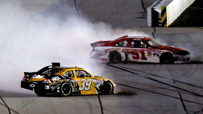 The original incident started when Kurt Busch blew out a tyre and spun the #51 car while running in the top ten with six laps remaining in the race; Ryan Newman was also involved in the incident. Fuming at the lost opportunity, Busch came on to pit road for a costly stop and exited his pit box in an angry burnout and plumes of tyre smoke that took him through Newman's pit box - where members of the #39 crew were still out working.
